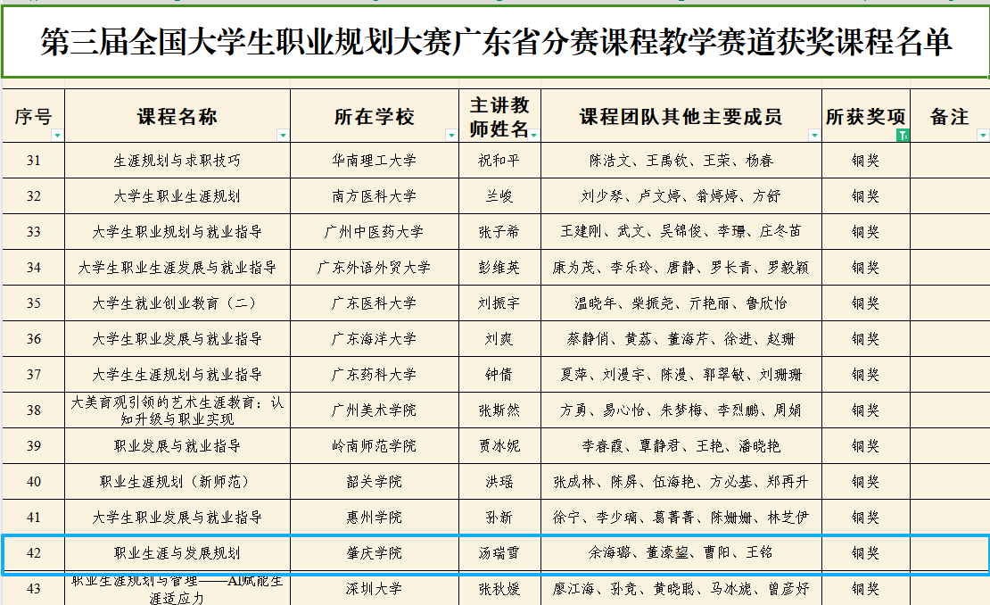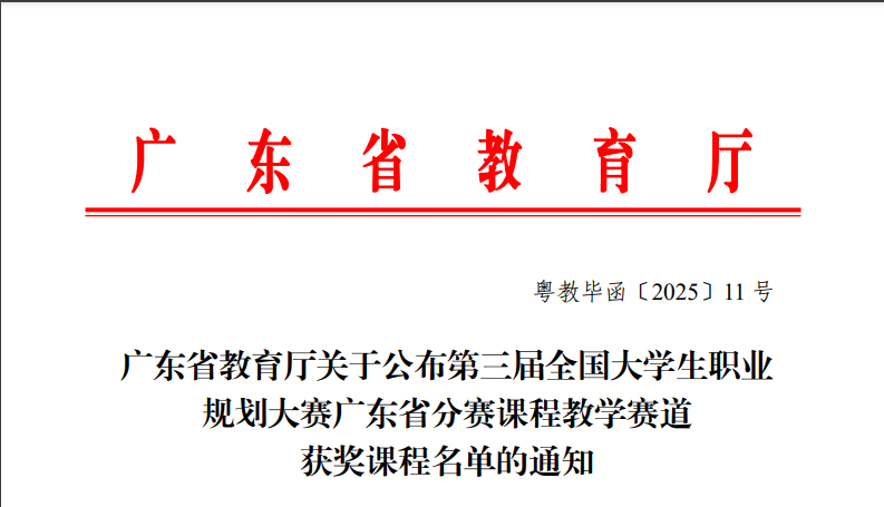 近日,广东省教育厅正式公布第三届全国大学生职业规划大赛广东省分赛课程教学赛道获奖名单。由我校汤瑞雪老师主讲,余海璐、董濠鋆、曹阳等老师共同参与的《职业生涯与发展规划》课程,历经多轮激烈角逐,斩获铜奖;这是我校在该赛事教学赛道上的首次获奖,实现了零的突破,标志着我校在该课程建设与教学创新方面迈出了重要一步。