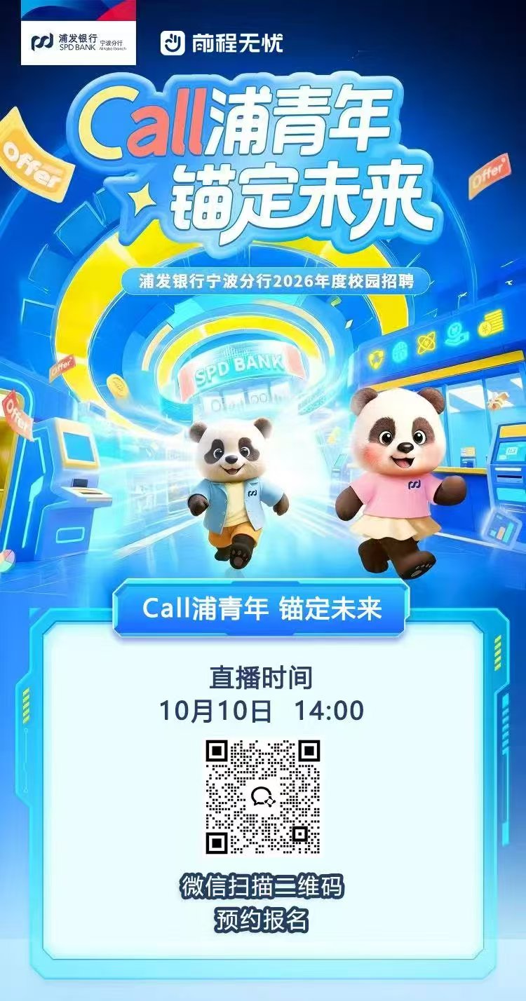 【10月10日下午】前程无忧浦发银行宁波分行2026年度校园招聘线上宣讲会