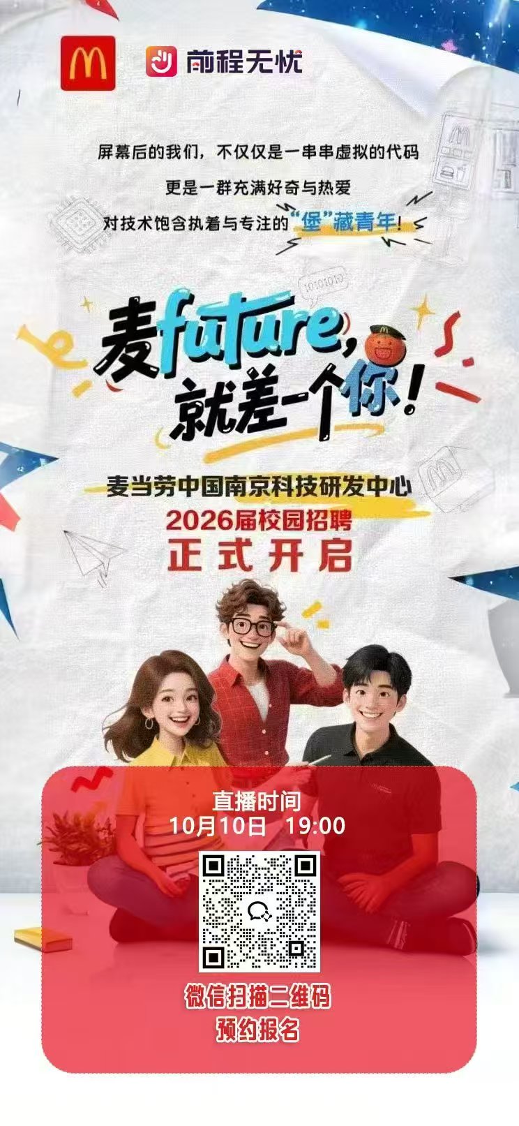 【10月10日晚上】前程无忧麦当劳中国南京科技研发中心2026届校园招聘线上宣讲会
